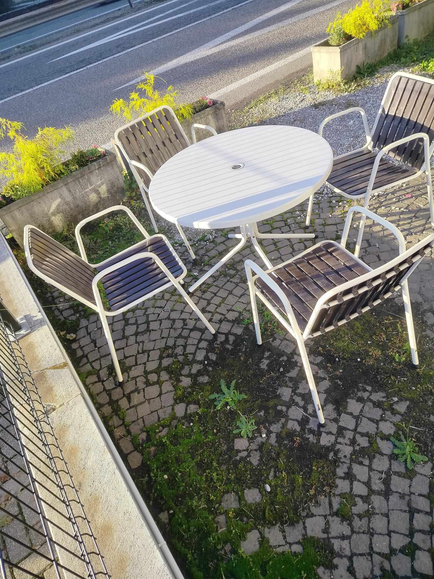 Tavolino in metallo bianco + 4 sedie seduta color marrone
